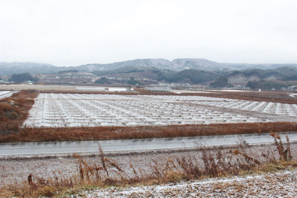 無事に越冬したことを確認したことで、翌年以降も植樹は継続され、本数は徐々に増えていきました。米崎町には苗木育成研究施設も完成。さらに2022年には栽培地を拡大し、市街地近くの圃場およそ4ヘクタールに、10品種550本の苗木を植えました。この圃場は、東日本大震災後にかさ上げされた市街地から見下ろせる場所にあります。市民や観光客に、生育していく過程を間近で見てもらいながら、この土地に適した品種を見極めていく。そんな狙いがありました。