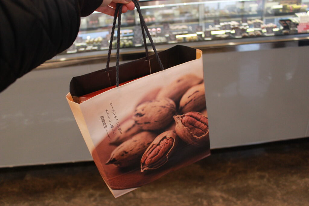 2022年、「陸前高田市ピーカンナッツ産業振興施設」が竣工し、加工工場を併設した「サロンドロワイヤルタカタ本店」がオープンしました。ピーカンナッツを使ったチョコレートやナッツ製品に加え、殻を活用した紅茶など、アップサイクル商品も取り扱っています。2023年には、国内初となる自動殻剥き機を導入。加工体制の効率化が進み、施設の稼働によって、店舗と工場を合わせて約20名の雇用が創出されました。スタッフの多くは陸前高田出身で、現在は運営のすべてを地元の手で担っています。
